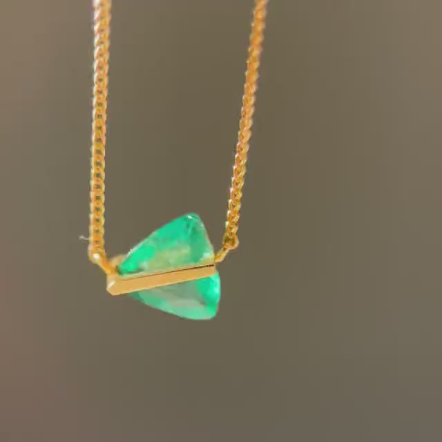 胸元に鮮烈なグリーンの輝きをもたらす、小ぶりで上品なネックレスです。個性的な三角形のフォルムはモダンで洗練された印象を与え、クラシックな石でありながら現代的な美しさを楽しむことができます。濃すぎない軽やかなエメラルドグリーンを厳選しBANDシリーズで仕立てることで、日常に寄り添うデザインでありながら、天然の高貴な輝きがさりげなくも特別感を演出します。