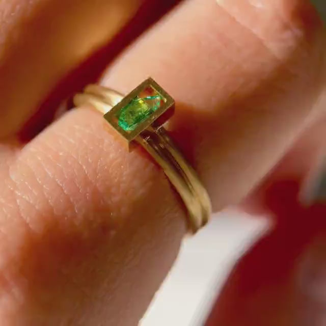 透き通るようなネオンブルーのパライバトルマリンのリング。控えめなサイズながらも特有の鮮やかさと色合いと輝きは、圧倒的な存在感を放ちます。枠の形と石の形が異なり、そこに浮いているかのように存在している独自のセッティングを施しています。角ばった長方形に対して丸みのある細いアームが重なることで、柔らかさもある印象に。